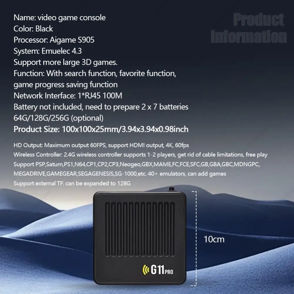 ![]() G11 Pro Retro Home Console Ultra Low Latency HD Video Game Console 4K HDMI-Compatible Output with 2.4G Wireless Dual Controllers Specification: Origin: Mainland China Color: Black Material: Plastic Memory: 64G/128G/256G (optional) Processor: Aigame S905 System: Emuelec4.3 Support more large 3D games Function: With search function, collection function, game progress saving function HD output: Maximum output 60FPS, support HDMI-Compatible output, 4K, 60fps Wireless controller: 2.4G wireless controller supports 1-2 players, get rid of the limitation of cables and play freely Support compatible with PSP, Saturns, PS1, N64, CP1, CP2, CP3, Neogeo, GBX, MAME, FC, FCE, SFC, GB, GBA, GBC, MDNGPC, MEGADRIVE, GAMEGEAR, SEGAGENESIS, SG-1000 and other 40+ simulators, games can be added Support external TF: expandable to 128G Network interface: 1*RJ45 100M Batteries not included, you need to bring 2 AA batteries Product size: 100x100x25mm/3.94x3.94x0.98inch Note: ![]() 1*G11PRO Game Console